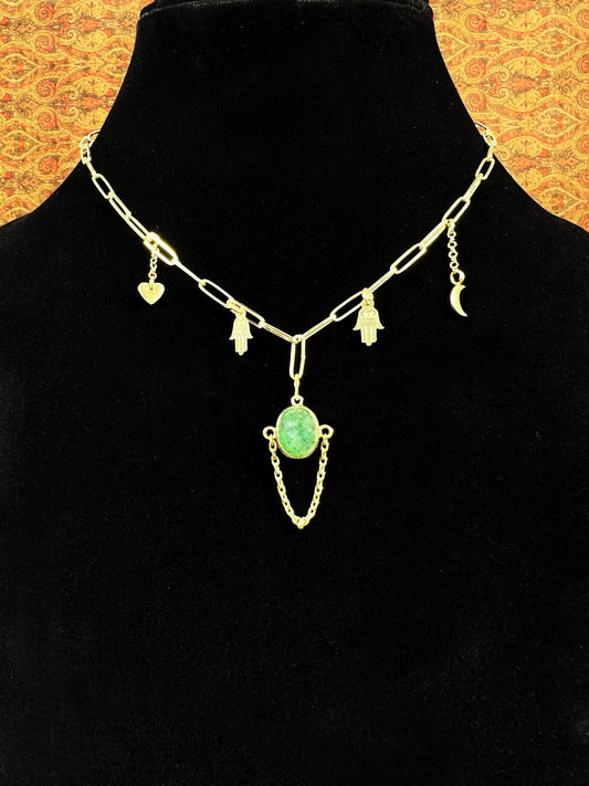 Womens Emerald Pendant Necklace on Gold Plated 925 Sterling Silver with Heart, Half Moon and Evil Eye Charms