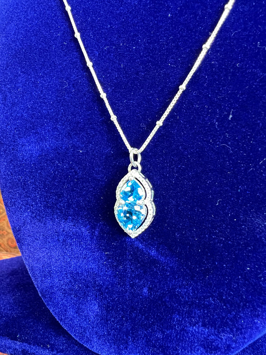 Womens Blue Topaz Heart Pendant 925 Sterling Silver Necklace on a Box Ball Silver Chain Basket Prong framed with Moissanites