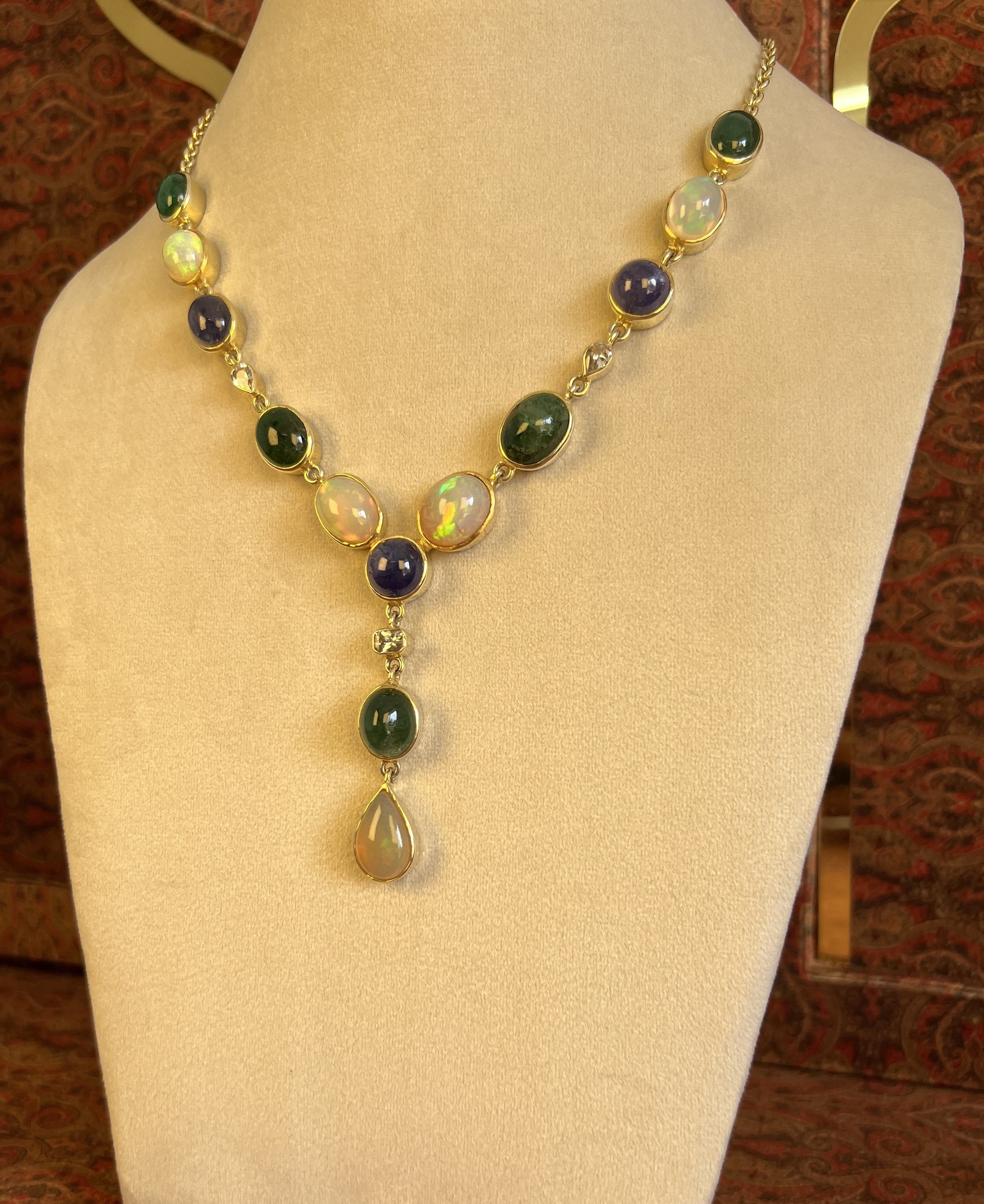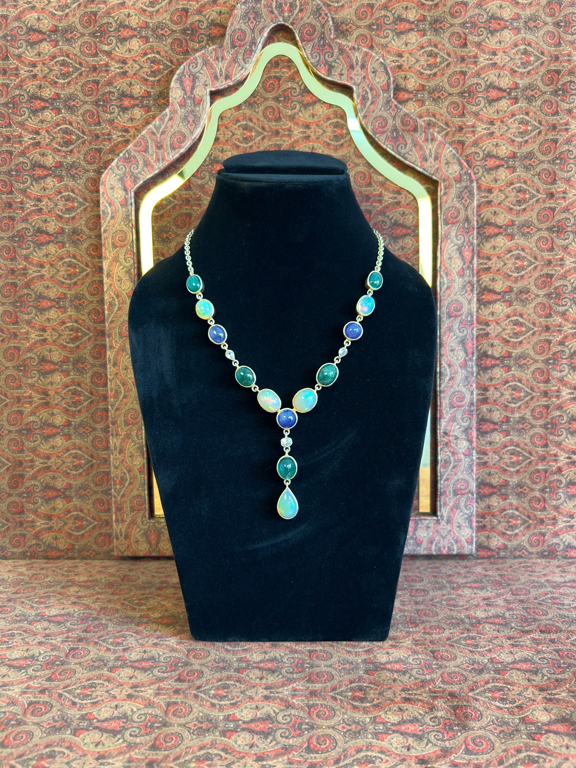 Womens Natural Opal, Emerald, Tanzanite and White Sapphire Gold Plated 925 Sterling Silver Lariat Necklace