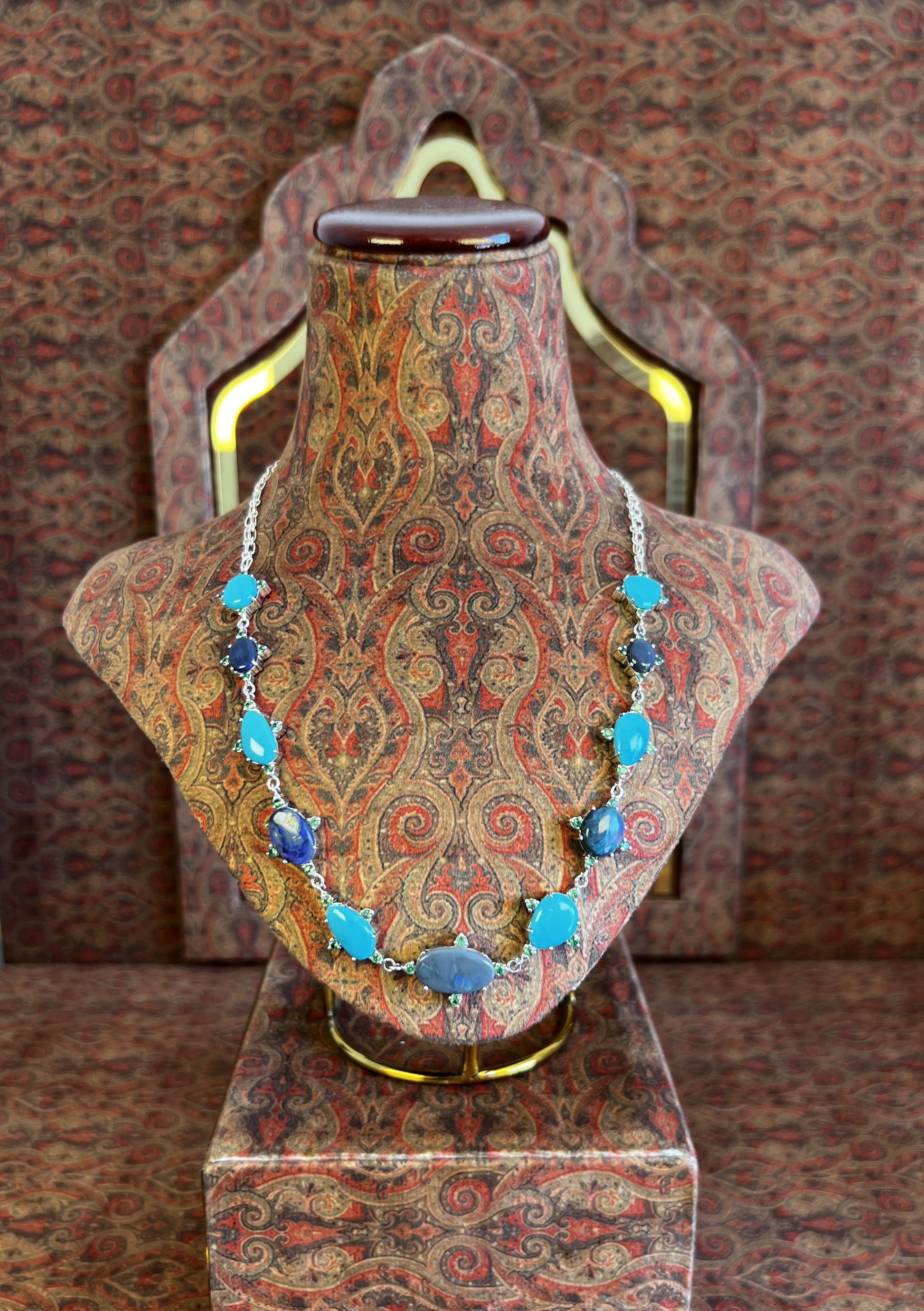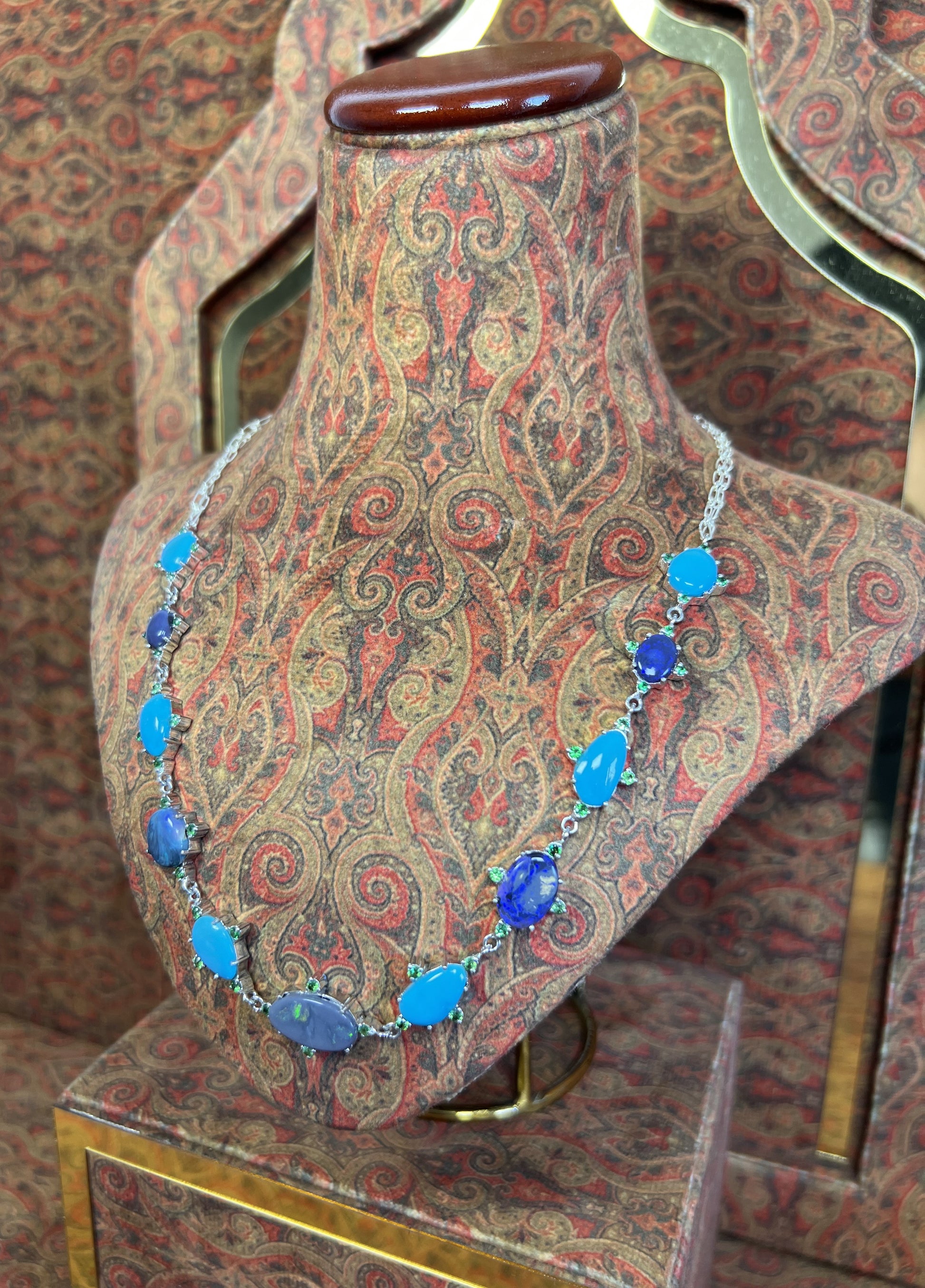 This is a beautiful 11 piece Bezel setting of alternating Australian Black Opals, American Sleeping Beauty Turquoise each set with 4 Kenyan Green Garnets on a 19" (48 cm) Sterling Silver chain. The necklace is adjustable down to 17" (43 cm) if you would like it to be a little tighter around your neck. There are 5 dazzling Australian Black Opals, including the oval cut center piece all mined from the Lightening Ridge Opal Fields in Eastern Australia. Two of the Australian Black Opals read as a royal rich blue, three read as a blueish grey. They are all stunning and really sparkle with that opal rainbow affect even out of direct light. There are also 6 American Sleeping Beauty Turquoise gemstones from Arizona. The Sleeping Beauty Turquoise really have that Robin's Egg Blue defining characteristic we love about turquoise. Each setting of alternating Australian Black Opals and American Sleeping Beauty Turquoise are framed with 4 small Kenyan Green Garnets. The dazzling shades of Blues and Greens really sparkle and the Australian Black Opals really glitter in sunlight.